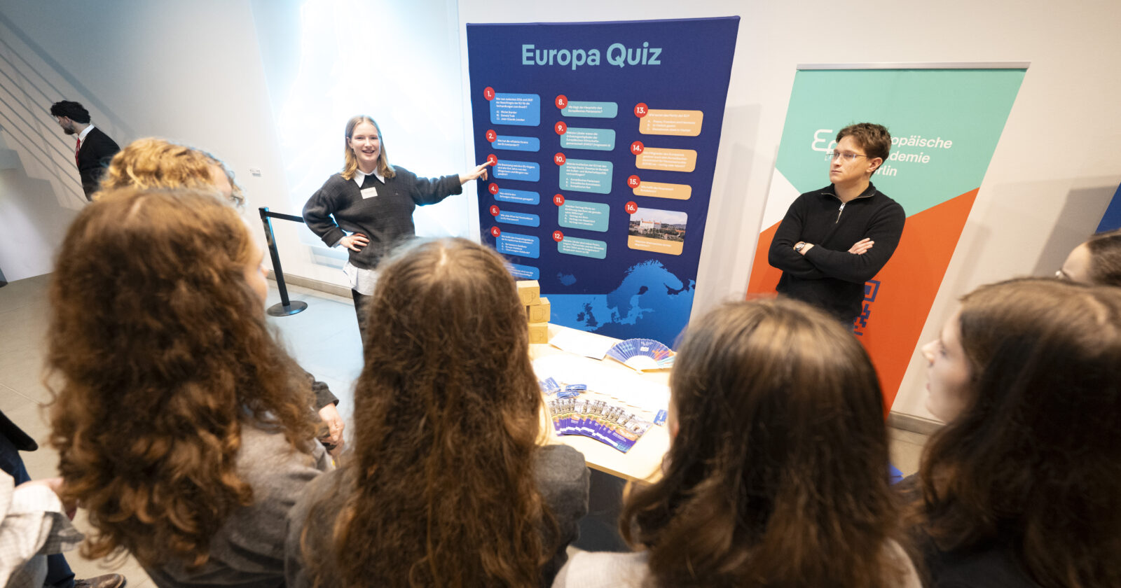 Mit großformatigen Quiztafeln und kurzen Fragerunden setzt die EAB selbst auf aufsuchende Beteiligung. Bei öffentlichen Diskussionsveranstaltungen bietet sie ein niedrigschwelliges und interaktives Rahmenprogramm. Ein kurzes Quiz zu europäischen Daten und Fakten schafft einen spielerischen Zugang zu europäischen Themen und ermöglicht einen ersten, unkomplizierten Kontakt mit Berliner Europa- und Demokratiethemen.